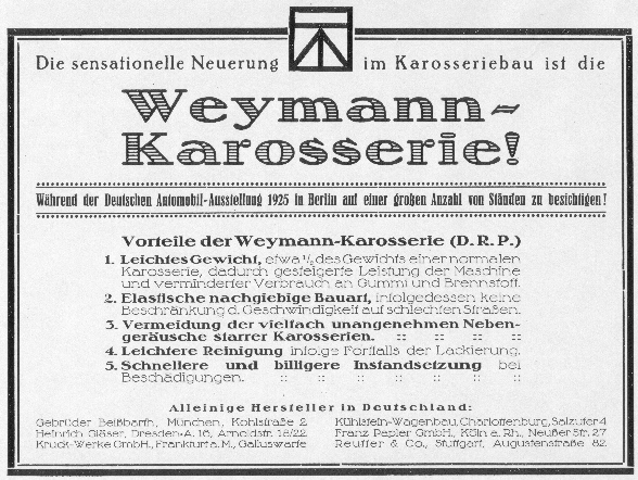 Das Inserat aus "Motor", Berlin, Dezember 1925, preist die Vorzüge der Weymann-Karosserie an.